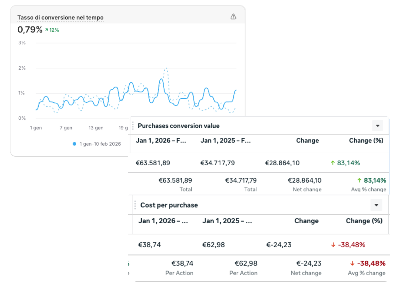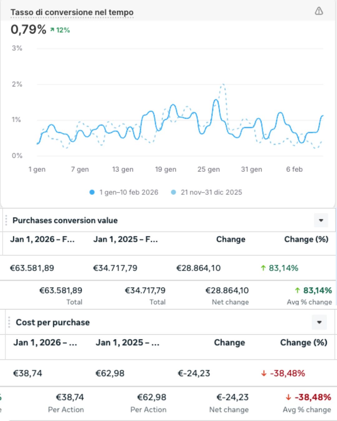 Nuovo sito lanciato, con Conversion Rate incrementato del 12%, CPA ridotta del 38% e valore delle conversioni aumentato del +80%. Il tutto, mantenendo lo stesso budget adv.